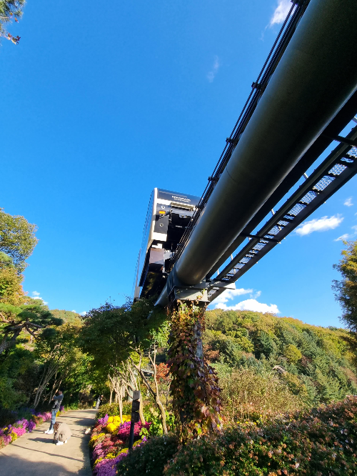 모노레일은 화담숲 서쪽 이끼원 입구에서 정상을 거쳐 분재원까지 이어지는 1,213m 순환선입니다. 전체 운행 소요시간은 약 20분인데, 솔직히 이건 예상 밖이었습니다. 처음엔 '그냥 편하게 올라가는 교통수단' 정도로 생각했는데, 창밖으로 보이는 풍경이 생각보다 훨씬 좋았습니다.